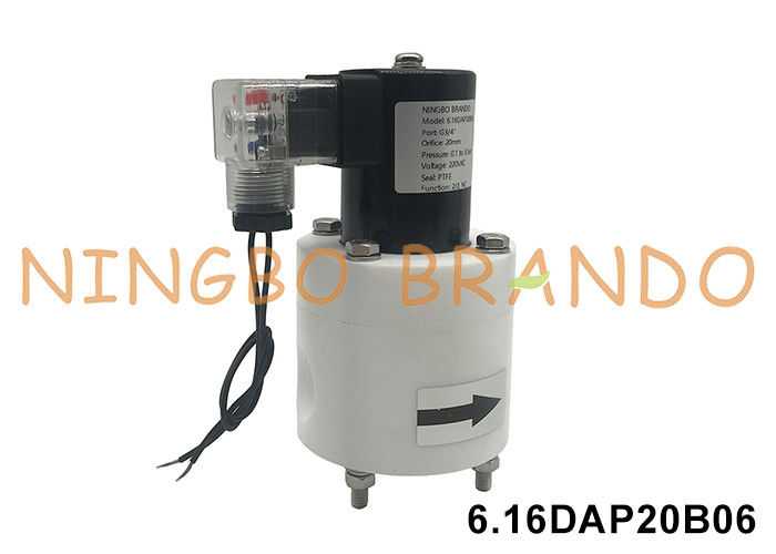 هذا صمام الكهربائي PTFE مضاد للتآكل، 3/4 'حجم منفذ المرأة المتداخلة، 20mm حجم فتحة، 2/2 الطريق مغلقة بشكل طبيعي، الطيارالمكبستعمل، 0.01 إلى 0.6 MPa ضغط العمل، يمكن أن يكون EPDM، FKM أو PTFE الختم لتتناسب مع مختلف وسائل العمل، والجهد المختلف للاختيار الخاص بك، مثل 12VDC، 24VDC، 24VAC، 110VAC و 220VAC، الخيستخدم في مجموعة واسعة من التطبيقات الصناعية للتحكم في السوائل.